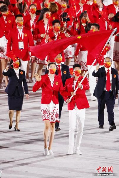 中新社北京7月23日电(记者 杜燕)身高1.98米的中国女排运动员朱婷、身高1.88米的中国跆拳道运动员赵帅共同执旗,鲜艳的五星红旗飘扬在日本东京新国立竞技场,中国体育代表团成员们身着红白拼色礼服亮相东京奥运会开幕式。