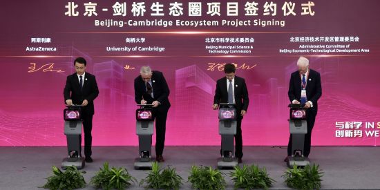 10月25日,剑桥大学,北京市科学技术委员会、中关村科技园区管理委员会,北京经济技术开发区管理委员会,阿斯利康四方就北京-剑桥-阿斯利康科学创新生态建设签约。记者 富田 摄