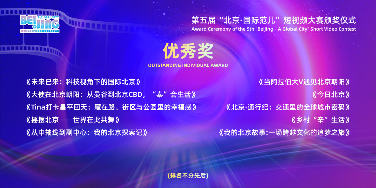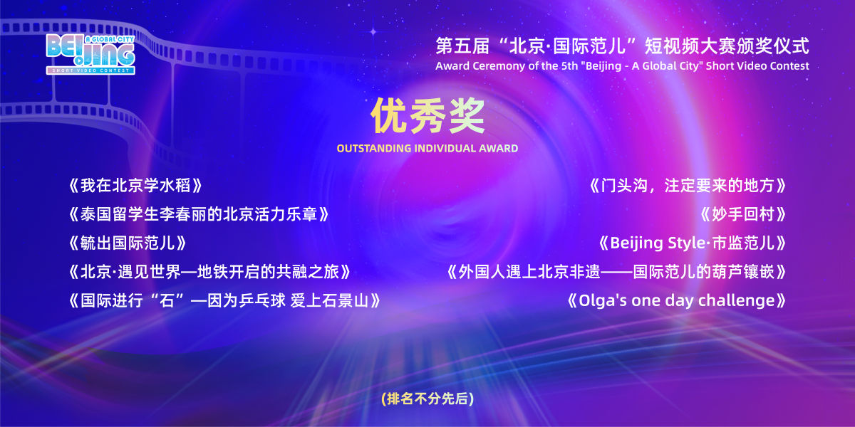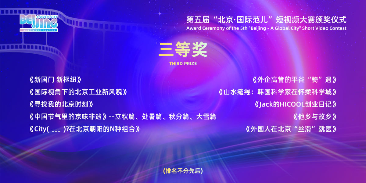中新网北京新闻12月30日电 12月29日,第五届“北京·国际范儿”短视频大赛颁奖仪式在中国电影博物馆举办,《China Travel in北京》等47部作品分获一二三等奖、优秀奖和单项奖。北京第二外国语学院党委宣传部等单位获得优秀组织奖,北京电影学院贾婷等获得优秀指导奖。
