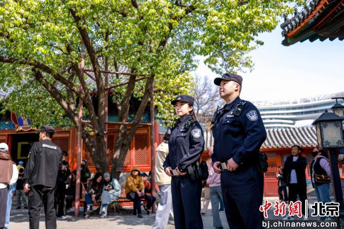 在龙潭公园“春漫龙潭”生态文化市集,80余个摊位吸引游客驻足体验,现场人头攒动、热闹非凡。民警在出入口、主通道等区域加强巡逻值守,引导游客有序进出、文明游览。在同样热闹的隆福寺街区,“隆福潮集”人气持续升温,传统老字号与新兴业态交织,巡逻民警穿梭其间,维护现场秩序,不时提示群众注意人身和物品安全。