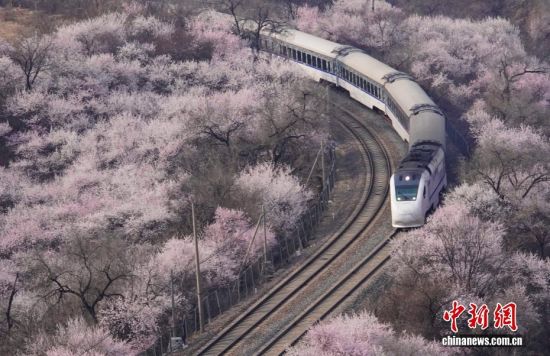 北京居庸关长城山花绽放 列车穿行花海美景如画