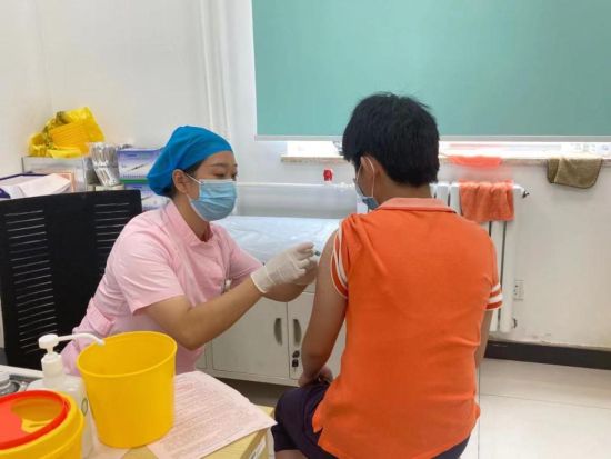 27日,北京市朝阳区太阳宫乡疫苗接种点,医务人员为青少年接种新冠疫苗。(摄影:徐婧)