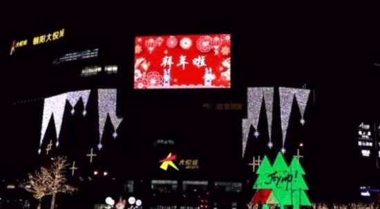 在北京市朝阳区内的合生汇、朝阳大悦城、三里屯太古里、蓝色港湾、富力广场、世贸天阶、通盈中心、蓝岛大厦、京信大厦等重点商圈的9处巨型户外电子屏聚焦福兔与新年元素,一齐换上“新年装”。