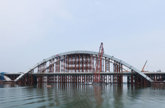 为了建造京雄大桥,施工方中铁上海工程局利用两台610吨浮吊进行安装施工,这也是北京首次在不通航水域,引入如此大规模的浮吊用于桥梁建设。施工过程中,利用360度无死角监测系统,实时显示吊装关键指标,精准把控拱肋翻身、起吊、行走、就位等环节。对“积木”进行拼接时,还需用三维液压千斤顶“精调”,将误差控制在毫米级,确保工程精益求精、万无一失。