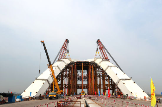 据介绍,京雄大桥主桥桥梁采用飞燕式拱桥结构,桥梁拱肋和主梁均采用钢结构设计,钢材用量达2.2万吨。为了方便加工制造和吊装,全桥钢结构共划分成126个形态各异的钢“积木”,最重的单个240吨,最大长度48米、宽9米,采用两台200吨级液压模块车进行运输。