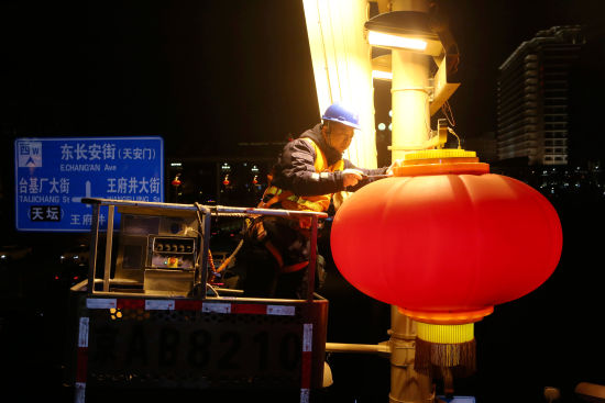 中新网北京2月3日电 (魏晓彬)随着国网北京电力城市照明管理中心检修运行人员完成调试,长安街上悬挂的大红灯笼和中国结2日晚全部点亮,与首都市民一起迎接龙年的到来。