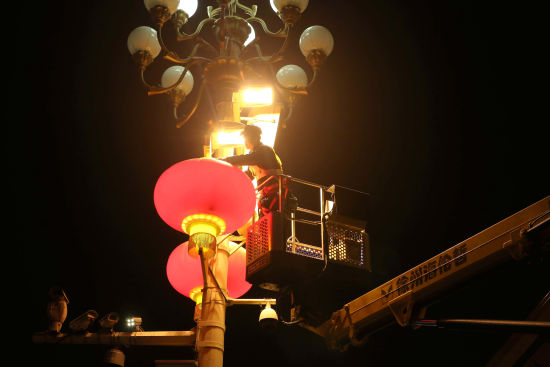 2月1日晚,国网北京市城市照明管理中心工作人员正在调试长安街上悬挂的大红灯笼。(来源:中新网 摄影:张超)
