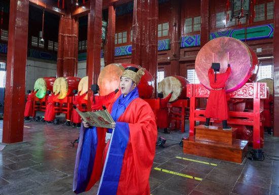 中新社北京2月10日电 (记者 杜燕) 中国农历甲辰龙年正月初一(2月10日)12时许,代表“1年+12个月”的13位鼓手在北京鼓楼敲响鼓点,随后108声悠远绵长的钟声在鼓楼正北面的钟楼响起。