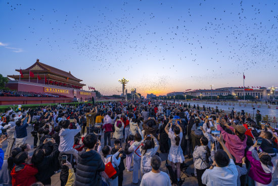 6时11分,国旗升至旗杆顶端,在澄澈如洗的碧空下迎风飘扬。随后,万羽和平鸽飞向天空,绕着天安门广场翱翔。