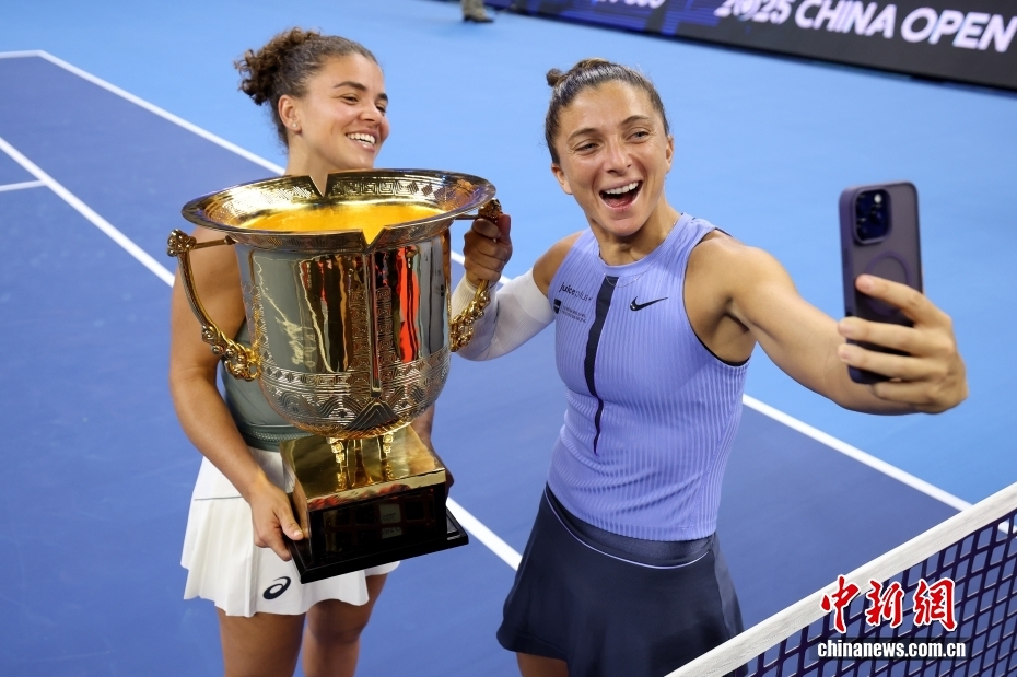 10月5日,在北京进行的2025中国网球公开赛女子双打决赛中,埃拉尼/保利尼组合以2-1逆转战胜加藤未唯/斯朵拉组合夺冠,成为自2004年中网创办以来首对成功卫冕的女双组合。图为埃拉尼(右)/保利尼赛后自拍合影。