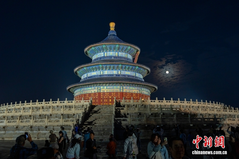 10月6日是中秋佳节,北京天坛公园祈年殿亮灯,一轮圆月从东方升起,与祈年殿交相辉映。 中新社记者 张炜 摄