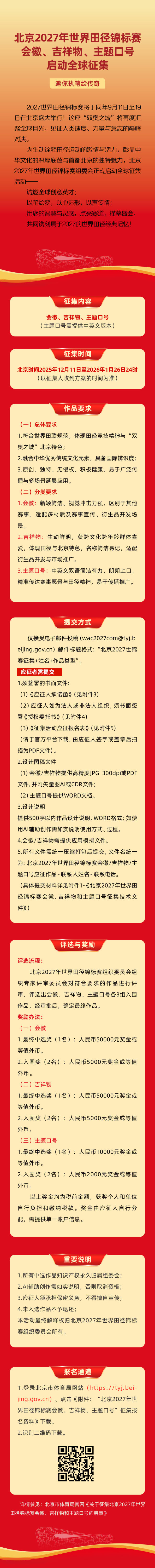 2027年,世界田径的焦点将再次聚焦北京。北京2027年世界田径锦标赛组委会正式启动会徽、吉祥物及主题口号全球征集活动,诚邀全球创意人才共同参与,为“双奥之城”注入新活力!
