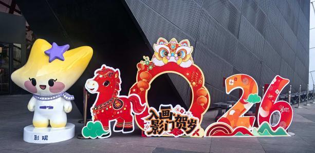 中国电影博物馆的网红打卡点以中国红为基调、鎏金马年元素为核心,对室内外进行全方位氛围布置,将物理空间转化为可步入的“春节叙事剧场”,让年味与电影美学相融。