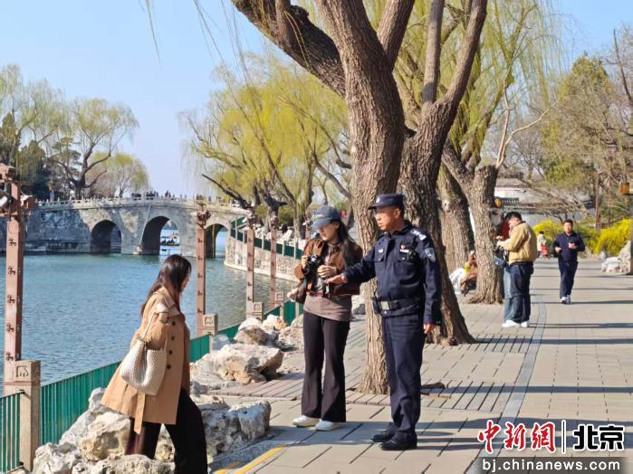 位于西城的北海公园,园内琼华岛畔、太湖石旁迎春花金黄烂漫,与白塔碧水交相辉映,是群众春游踏青的热门打卡地。为了给广大市民群众提供安全有序的游园环境,西城公安分局北海公园派出所提前现场踏勘,制定秩序维护和大客流疏导方案预案,部署警力和园区安保力量开展定点值守、常态化巡逻。据近期园区客流量数据显示,非工作日的下午属于高峰时段,警方根据实际情况,灵活采取交替放行、分段引导等措施进行疏导,确保客流井然有序。执勤民警在湖畔、石桥等重点区域,不时提示游客拍照时注意脚下,提醒家长让儿童远离水域边缘,藏蓝身影成为一道暖心的风景线。